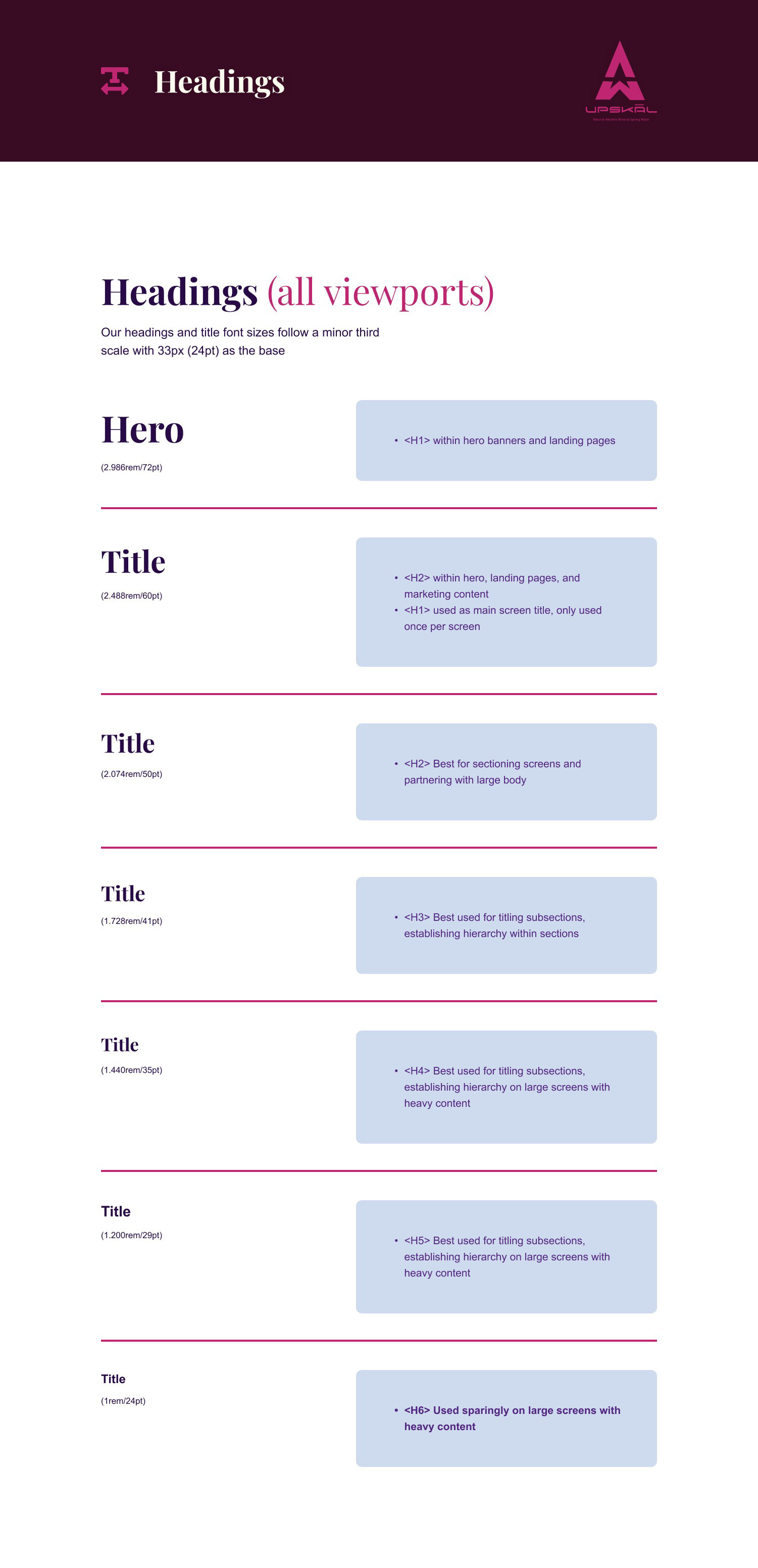 I spearheaded the development of Upskāl’s core design system, creating the foundational documentation that ensures brand consistency and scalability. This included defining the color palettes, typography guidelines, responsive logo sizing, iconography standards, and initial component library.